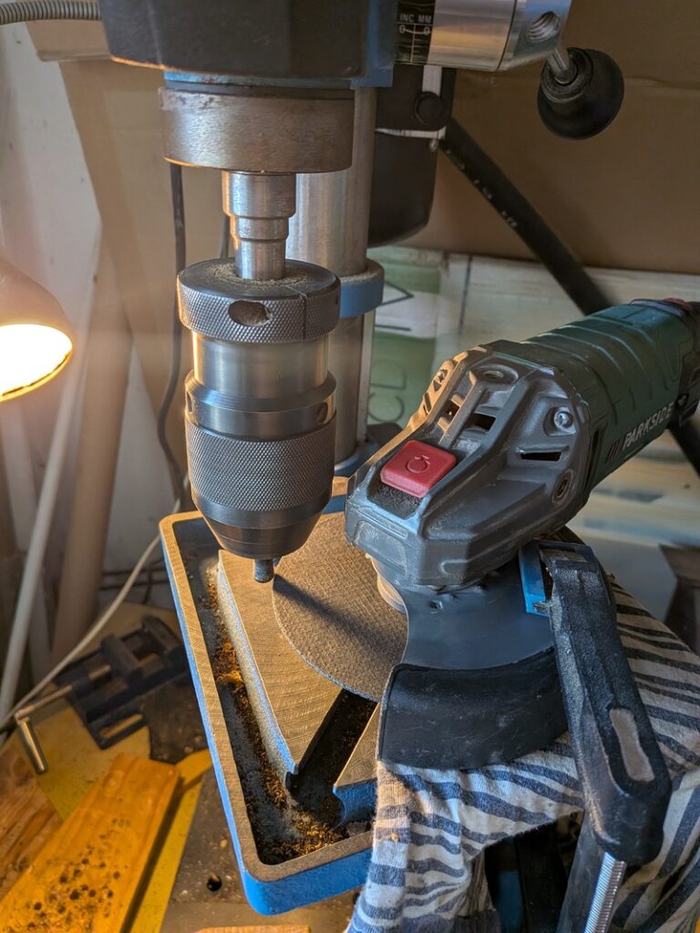 As I had lengthen the rod, now, I had to set the right length… without a lathe. So I’ve improvised a setup with a drill-press and and angle grinder. It worked out quite okay. Of course the 2 decimal precision was not something I can achieve with this, but we do not have to be that precise, right? Right?